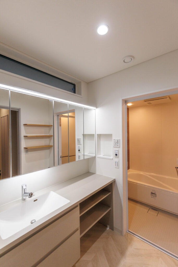 タッチレスの照明がついた幅いっぱいの五面鏡は収納もたっぷりで機能性も抜群です。
