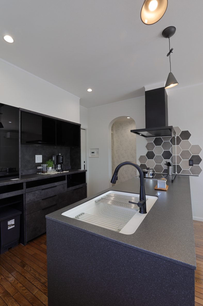 キッチンの周りを一周でき、その空間の顔ともなる存在感のある仕様が特徴となります。