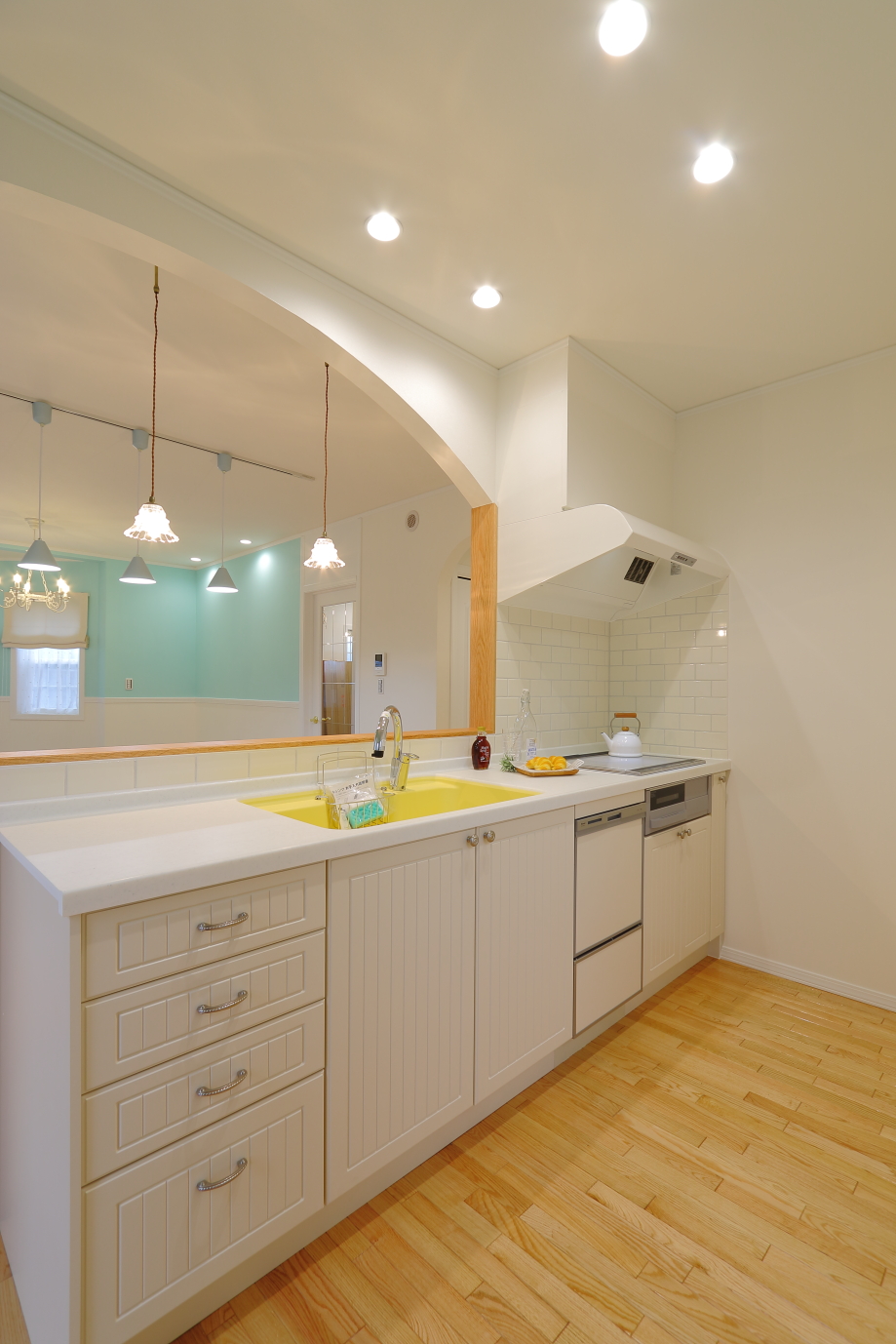 この場合は対面キッチンと呼ばれることが多く、腰壁にキッチンを付けることによりコストを抑えたり、調味料置き場やカウンターを作成することができ自由なスタイルが可能となっております。